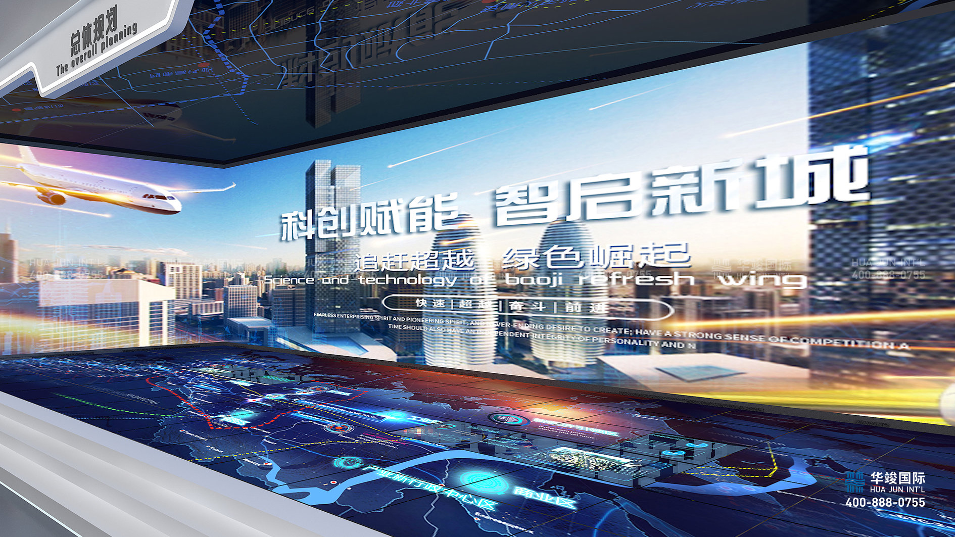 總體規(guī)劃主要內(nèi)容為一心/兩軸/三組 團(tuán)的總體規(guī)劃布局,利用沉浸式數(shù)字沙盤體驗(yàn)數(shù)字科技感的空間氛圍,使參觀者身臨其境,切身融入到高新區(qū)科技新城的場景之中。